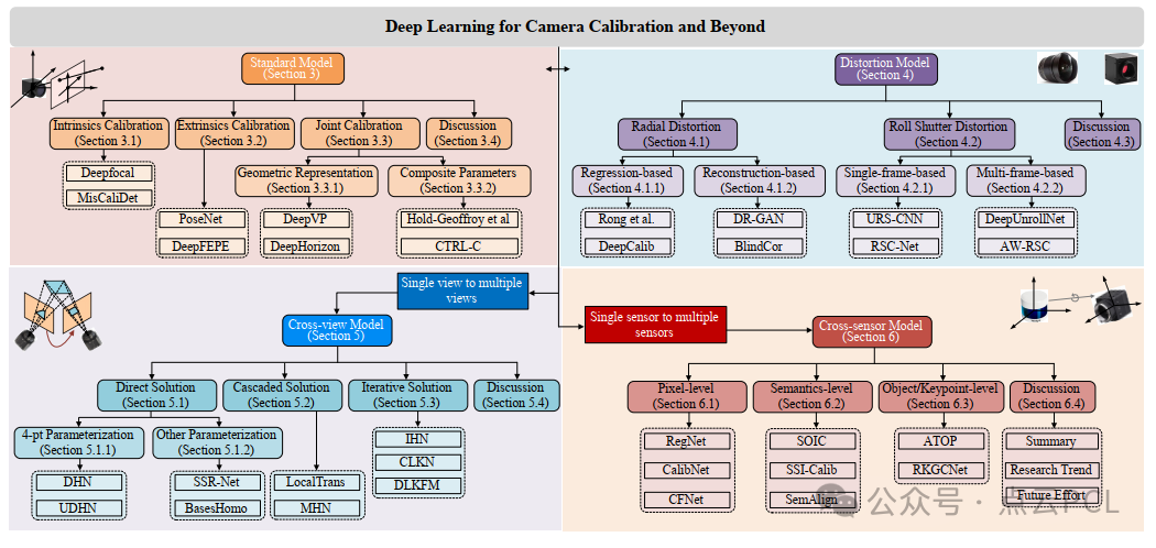 图 2. 基于深度学习的相机标定的结构化与层次化分类法。每个类别下列出了一些经典方法。