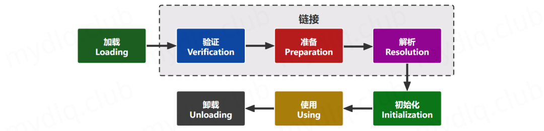 而其中链接又分为三个子阶段:验证(Verification)、准备(Preparation)、解析(Resolution)。