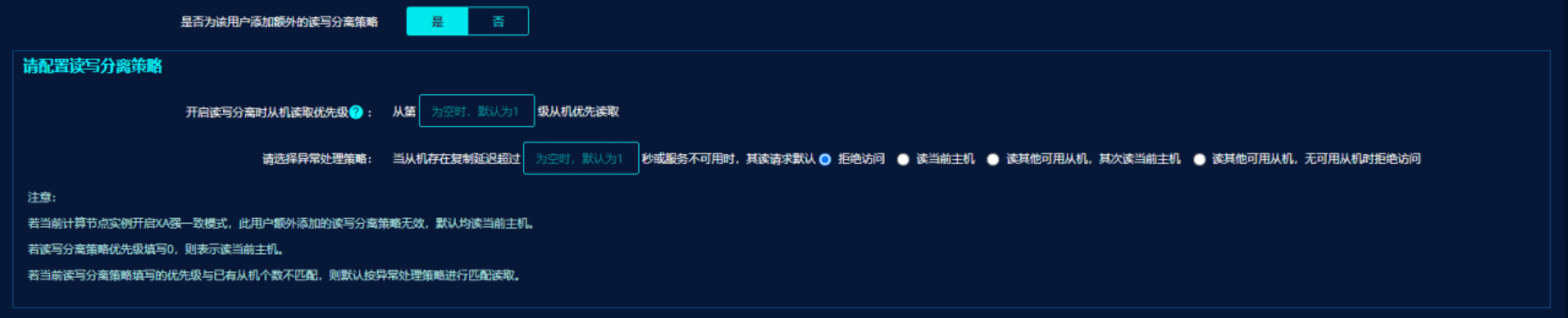 读写分离策略配置: 开启读写分离时从机读取优先级:可指定读取具体优先级的从库,默认为1,优先级以高可用配置中的切换规则优先级为准 异常处理策略:在从机复制延迟超出阈值或从机不可用时的读请求操作选项(复制延迟阈值可手动设置;异常处理策略分为“拒绝访问”、“读当前主机”、“读其他可用从机,其次读当前主机”、“读其他可用从机,无可用从机时拒绝访问”)