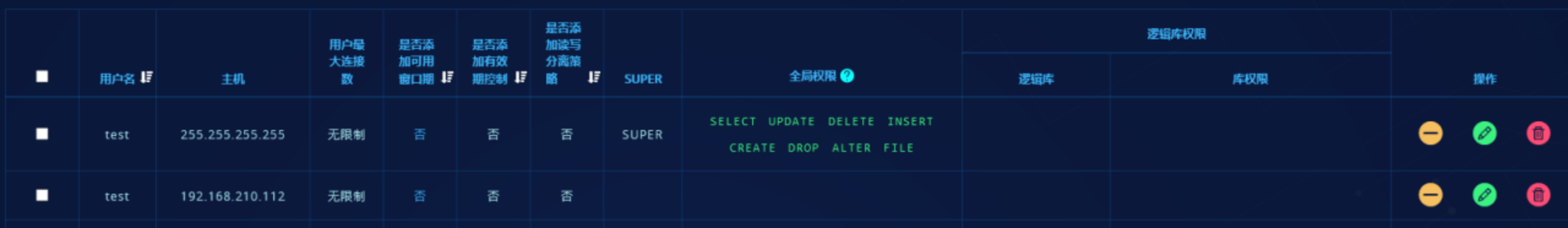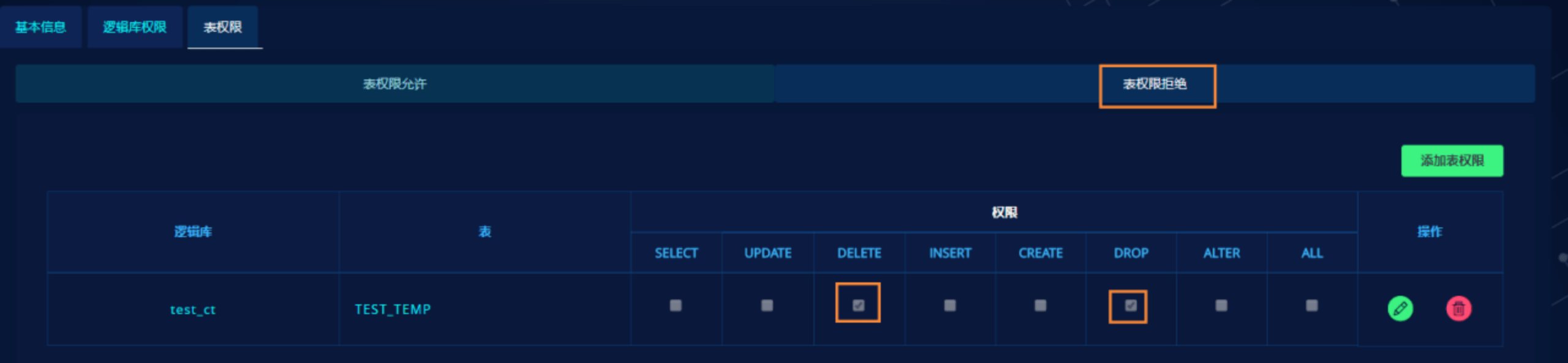 表拒绝权限可为某用户配置不允许对某张表执行相关动作,配置方法同表允许权限一致。使用时,需注意表拒绝权限优先级大于全局权限、逻辑库权限、表级允许权限。