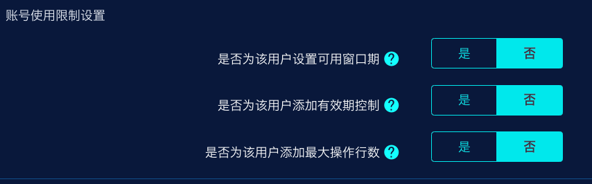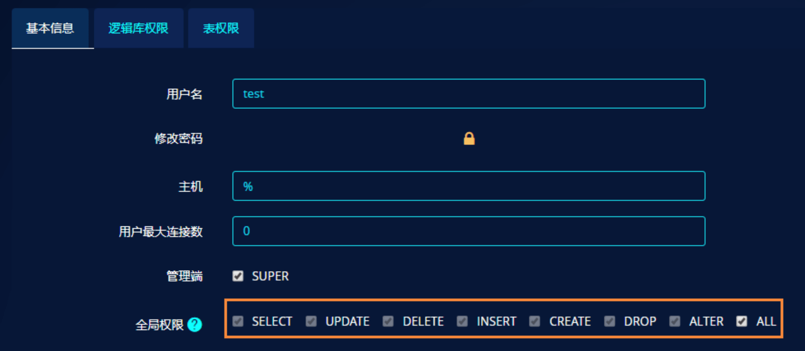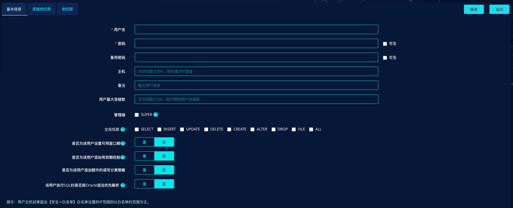 (一)基本信息: 包含必填项“用户名”、“密码”,选填项“备用密码”、“主机”、“用户最大连接数”、“默认分片节点”、“super权限”、“全局权限”、“是否为该用户设置可用窗口期”、“是否为该用户添加有效期控制”、“是否为该用户添加额外的读写分离策略”。