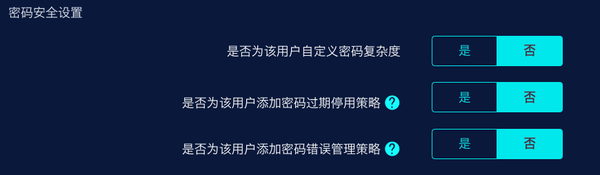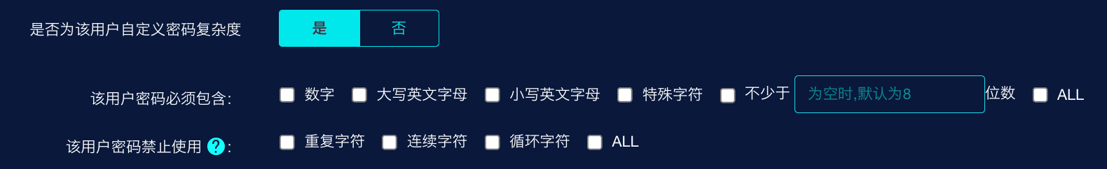 禁止使用字符均限制为3次,代表勾选的同类型字符不能连续出现3次及以上。 重复字符包含:数字、英文(区分大小写)、特殊字符。例如:111、aaa、@@@ 连续字符包含:数字、英文(区分大小写)。例如:123、abc、CBA 循环字符包含:数字、英文(区分大小写)、特殊字符。例如:121212、qweqweqwe、@#@#@#