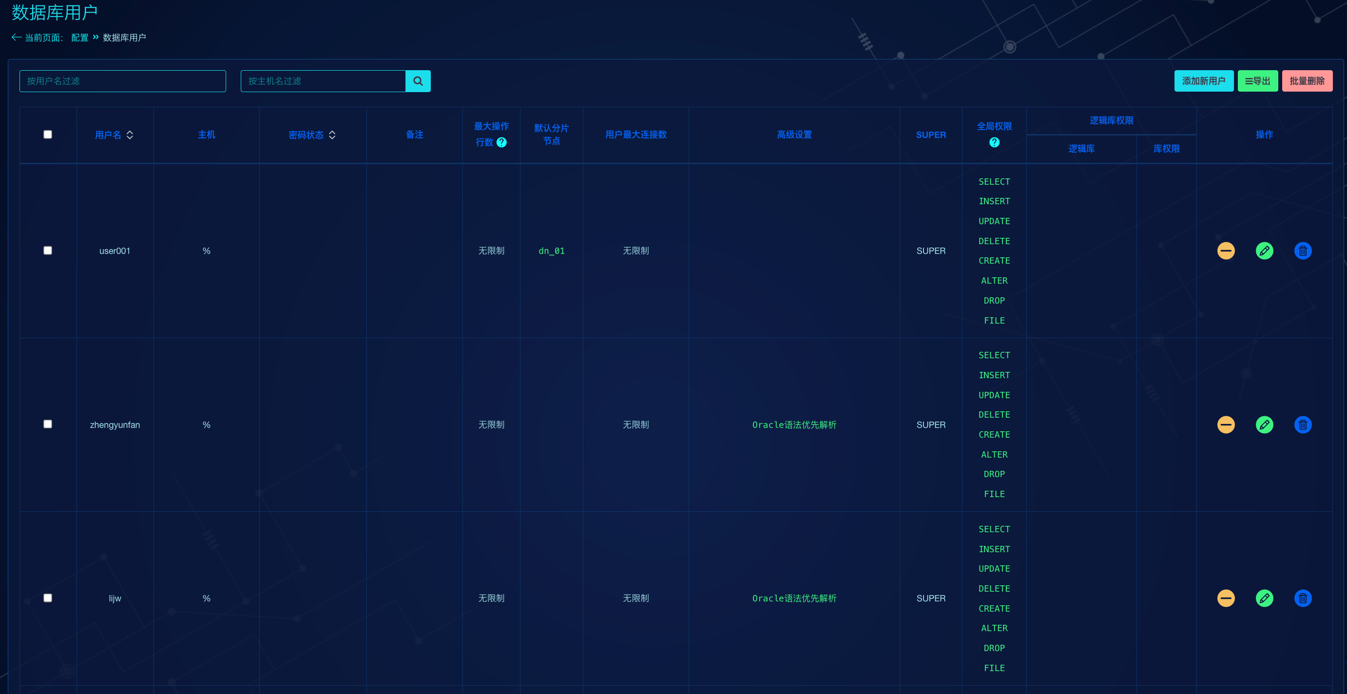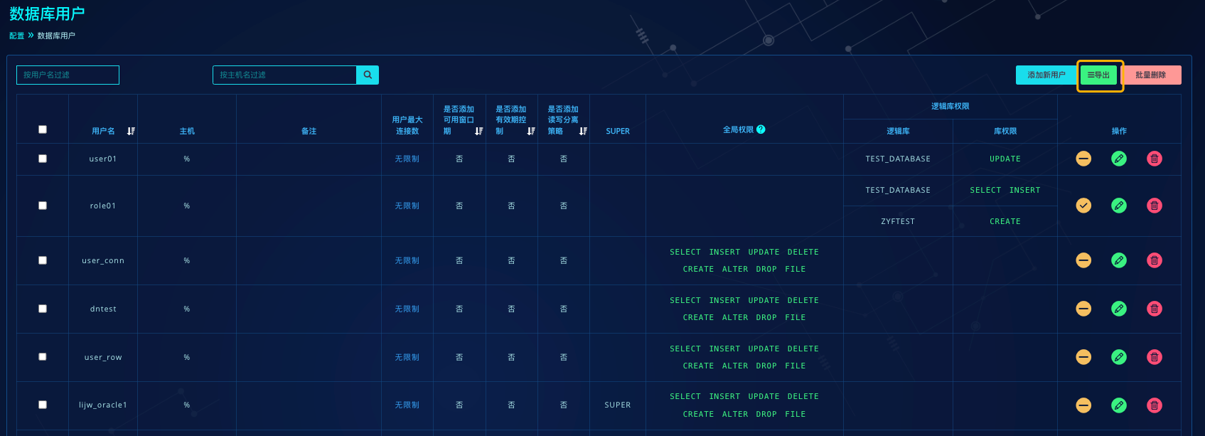导出功能支持生成CSV和XLS类型文件,导出的内容增加“默认分片节点”和“该用户执行SQL时是否按Oracle语法优先解析”,权限展示细化到表级别。 功能入口:在管理平台页面中点击“配置”->“数据库用户”->“导出”