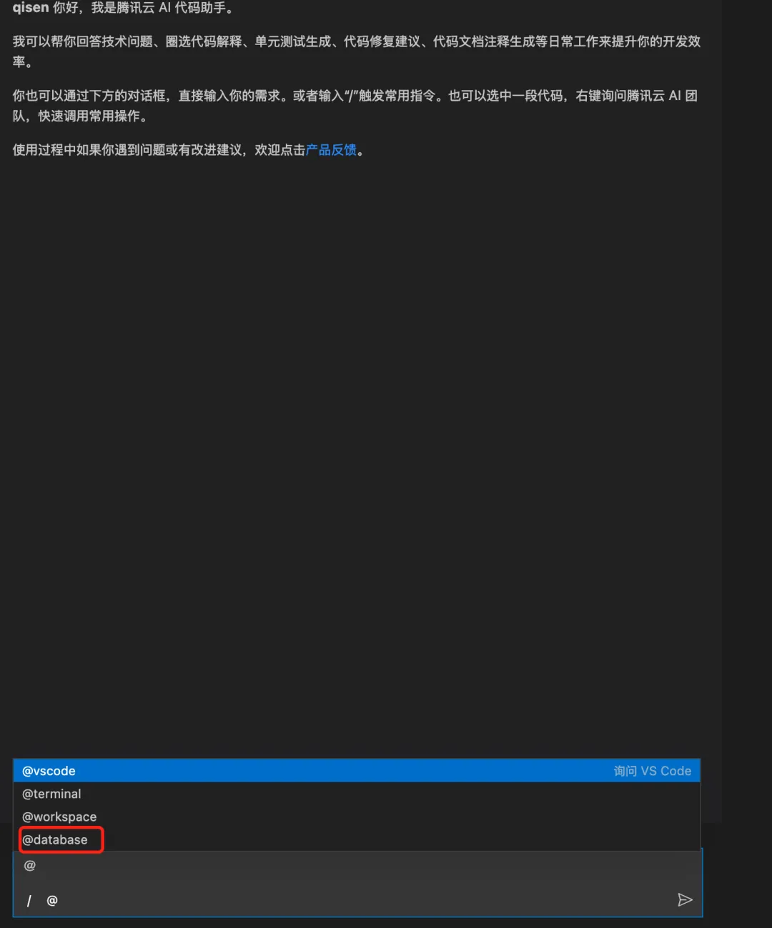 腾讯云 AI 代码助手内置 Extension 标准扩展的机制,通过该机制规范可以进行特性业务场景诉求的扩展和智能化能力聚合, Extension 扩展能力的业务承载表现就是与对话进行交互通过快捷指令的方式进行落地包含类似 @workspace、/fix 等方式进行智能体的唤醒交互。