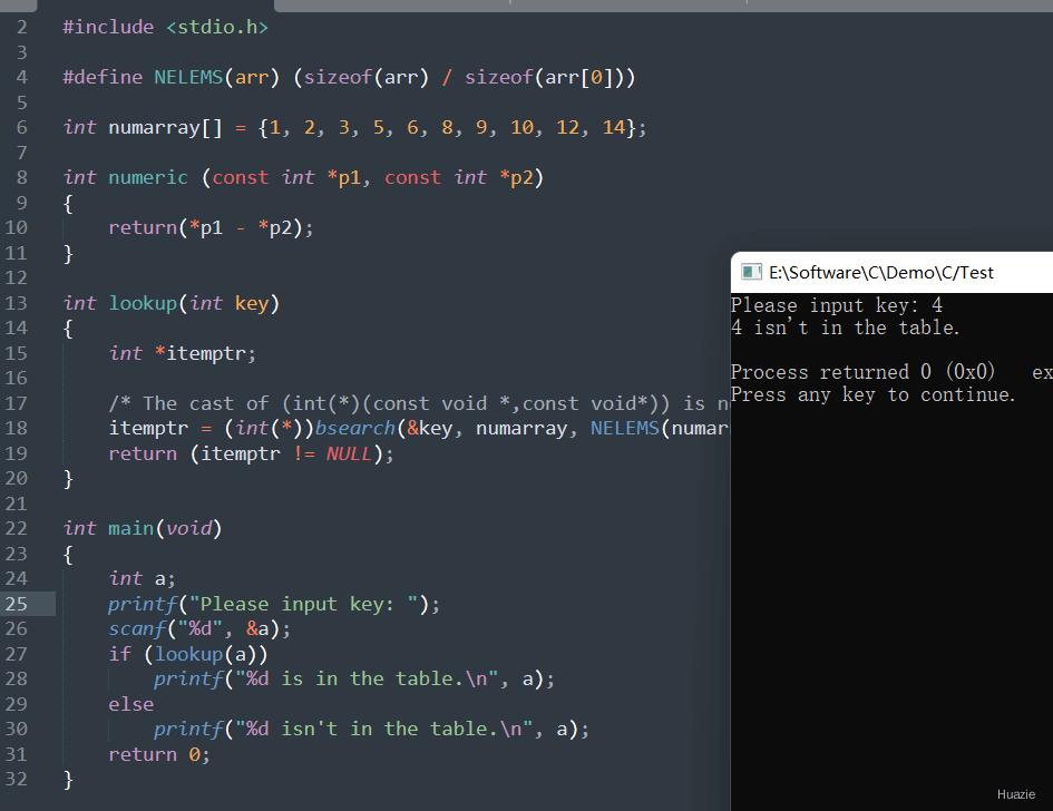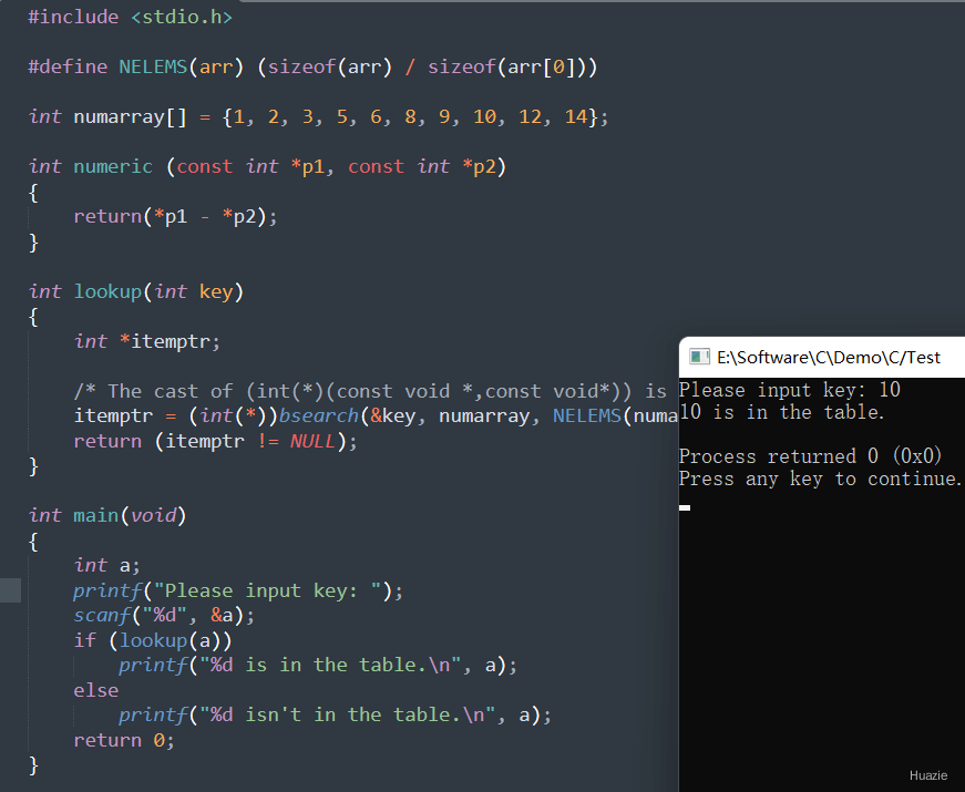 const void *key: 指向要搜索的元素的指针。key 指向的元素必须与 base 指向的数组中的元素具有相同的类型和大小。const void *base : 指向要搜索的数组的起始地址。数组中的元素必须已经按照某种顺序(通常是升序)排列好。size_t *nelem : 数组中元素的数量。size_t width: 数组中每个元素的大小(以字节为单位)。int(*fcmp)(const void *, const *) : 指向比较函数的指针。比较函数的返回值如下:小于0 :表示第一个元素小于第二个元素。等于0 :表示两个元素相等。大于0 :表示第一个元素大于第二个元素。#include <stdlib.h>