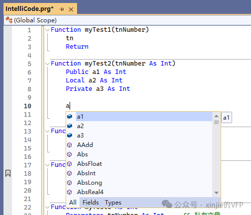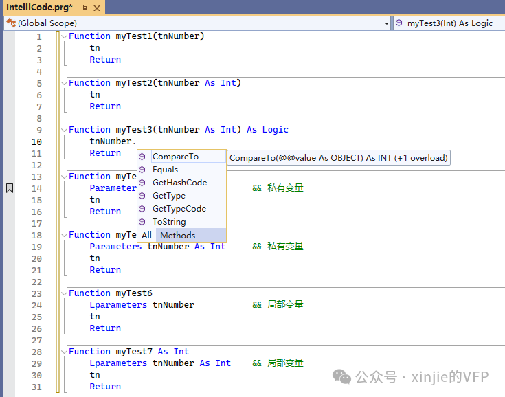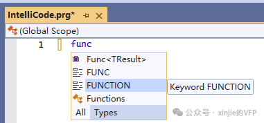 尽管在 X# 中也可以像 VFP 那样在很多情况下可以使用四个字符的简写,但是,也会有人键入完整的命令拼写(估计在大多数情况下是借助 IntelliSense)。因此,我们在这个 prg 中体验一下在 VS IDE 里如何使用 IntelliCode 。