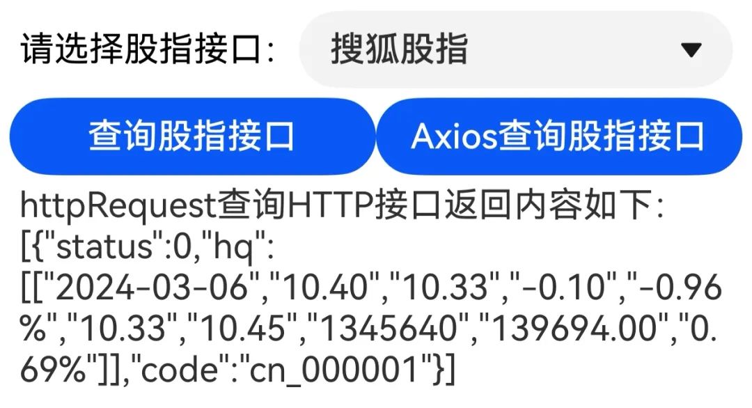 }经过以上三个步骤的HTTP请求操作,才算实现了一个GET类型的HTTP接口访问。以访问搜狐股指接口为例(https://q.stock.sohu.com/hisHq?code=cn_000001&start=20240306&end=20240306),下面是该接口返回的结果报文截图。