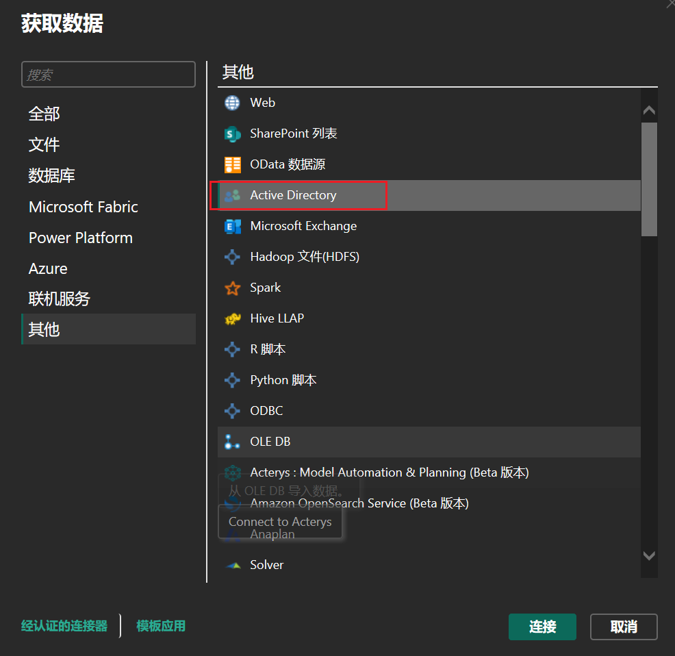 Active Directory ,作为Power BI自带支持的一种数据源,大家应该都见过这个玩意: