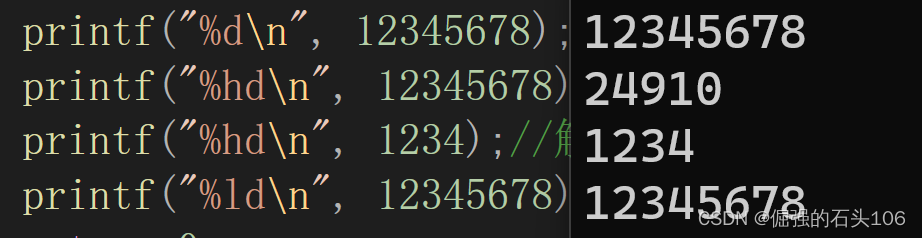 printf("%hd\n", 12345678);//解释为短整型输出(可能会丢失数据)