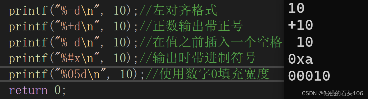 printf("% d\n", 10);//在值之前插入一个空格