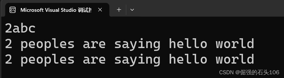 //%d 和 %s是转换说明符,分别对应附加参数——整型常量2 和字符串常量hello world