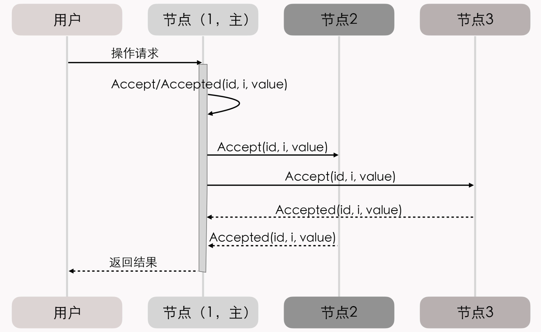 选主之后,所有客户端请求都会由主节点来完成提案,不再需要准备过程,只需要 执行批准交互即可:
