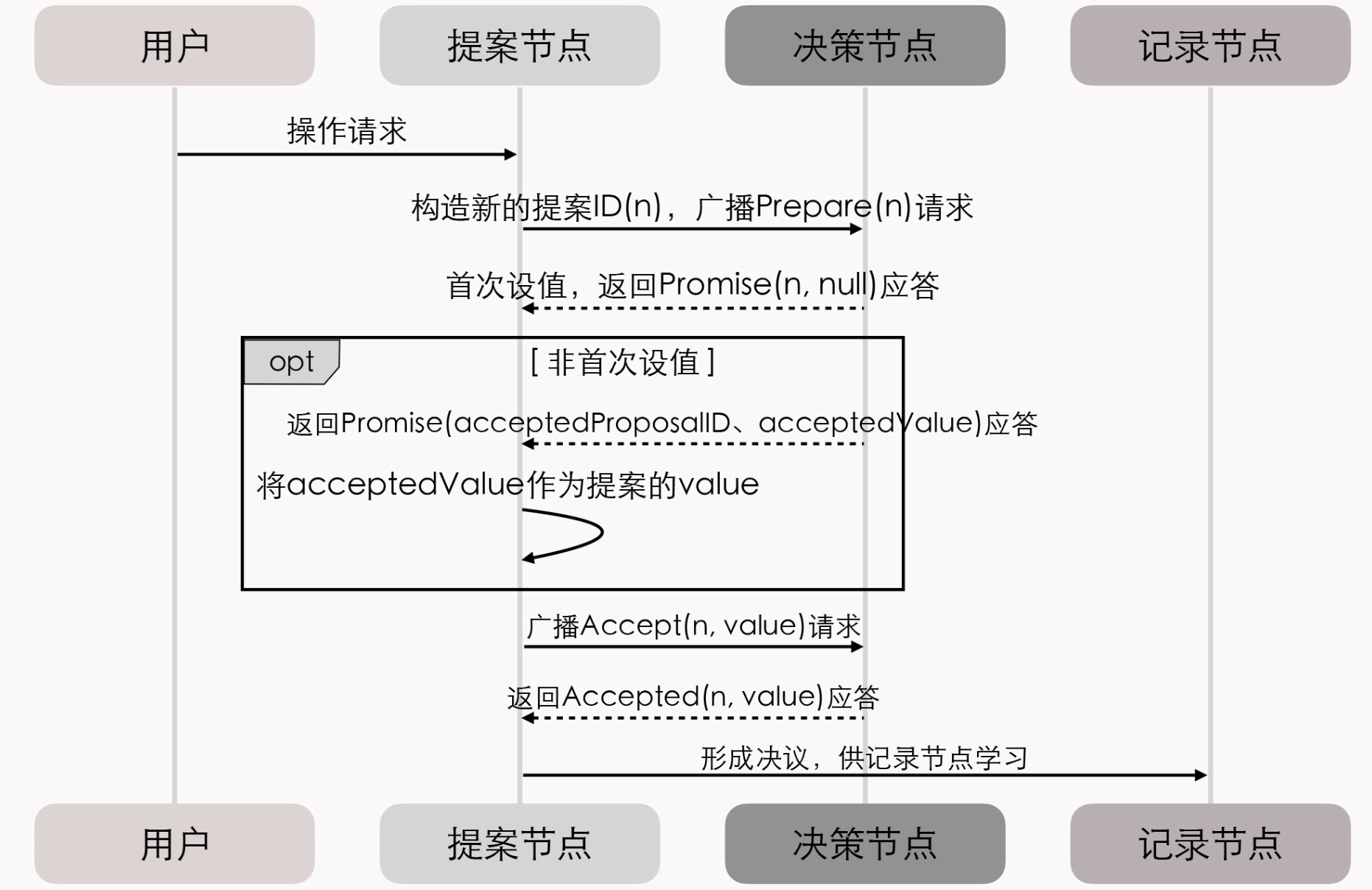 Basic Paxos算法将分布式系统中的节点分为提案节点、决策节点和记录节点三类