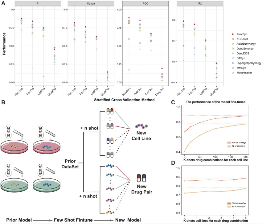 预测药物协同作用的未知数据是非常具有挑战性的。为了解决这一挑战,作者使用微调方法通过引入少量实验测量来提高JointSyn的性能(图4B)。对于CellOut分裂场景下的新细胞系,将该细胞系上的k种药物组合逐渐添加到训练集中(k-shot)。随着shot次数的增加,PCC和R2逐渐增大并趋于稳定(图4C)。150次shot时的性能指标接近随机分割。这意味着对于给定的药物列表,如果对细胞系实验测量21%(150/703≈21%)的组合,则可以很好地预测其余药物组合的协同作用。同样,k-shot微调提升了JointSyn在PairOut场景中的性能(图4D)。对于不在训练集中的药物组合,当将该组合在15%(5/34≈15%)细胞系上的协同得分加入到训练集中时,JointSyn可以很好地预测剩余细胞系上的协同作用。综上所述,带微调的JointSyn进一步提高了其预测泛化能力。