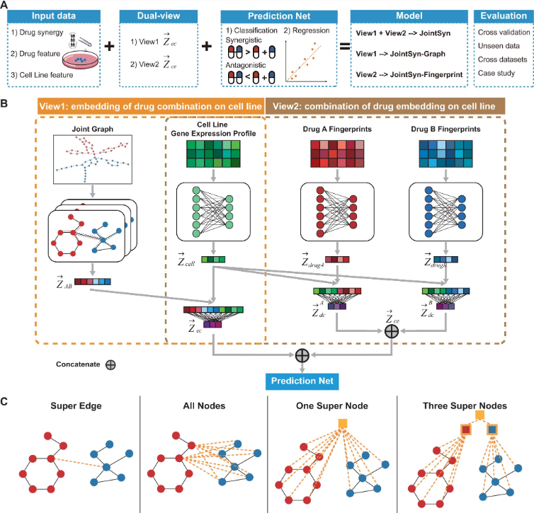 如图1所示,作者提出了一种名为JointSyn的新型深度学习方法来预测药物协同作用。JointSyn的输入是药物组合的联合图、两种药物的Morgan指纹图谱和细胞系的表达谱。JointSyn由两个视图组成:视图1提取药物组合在细胞系上的嵌入,视图2基于药物指纹提取药物的嵌入。随后,预测网络利用两种视图的嵌入来预测药物组合在细胞系上的药物协同作用。