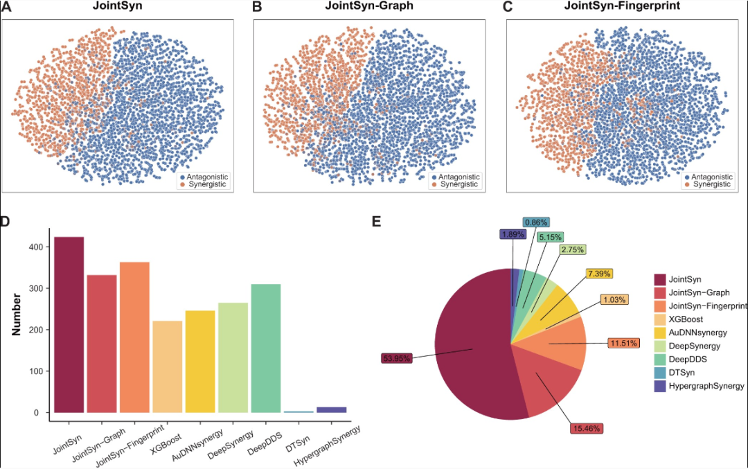 作者设计了消融实验来验证模型设计的有效性。消融实验中,JointSyn-Graph表示仅使用视图1(联合图),JointSyn-Fingerprint表示仅使用视图2(分子指纹)。作者使用t分布随机邻居嵌入(t-SNE)来可视化JointSyn最后一层的双视图嵌入(图3A)。与JointSyn-Graph(图3B)和JointSyn-Fingerprint(图3C)相比,结合双视图的JointSyn在嵌入空间中可以很好地区分协同三元组和拮抗三元组。这些结果表明,JointSyn的双视图表示在提取与药物协同相关的低维嵌入方面是成功的。