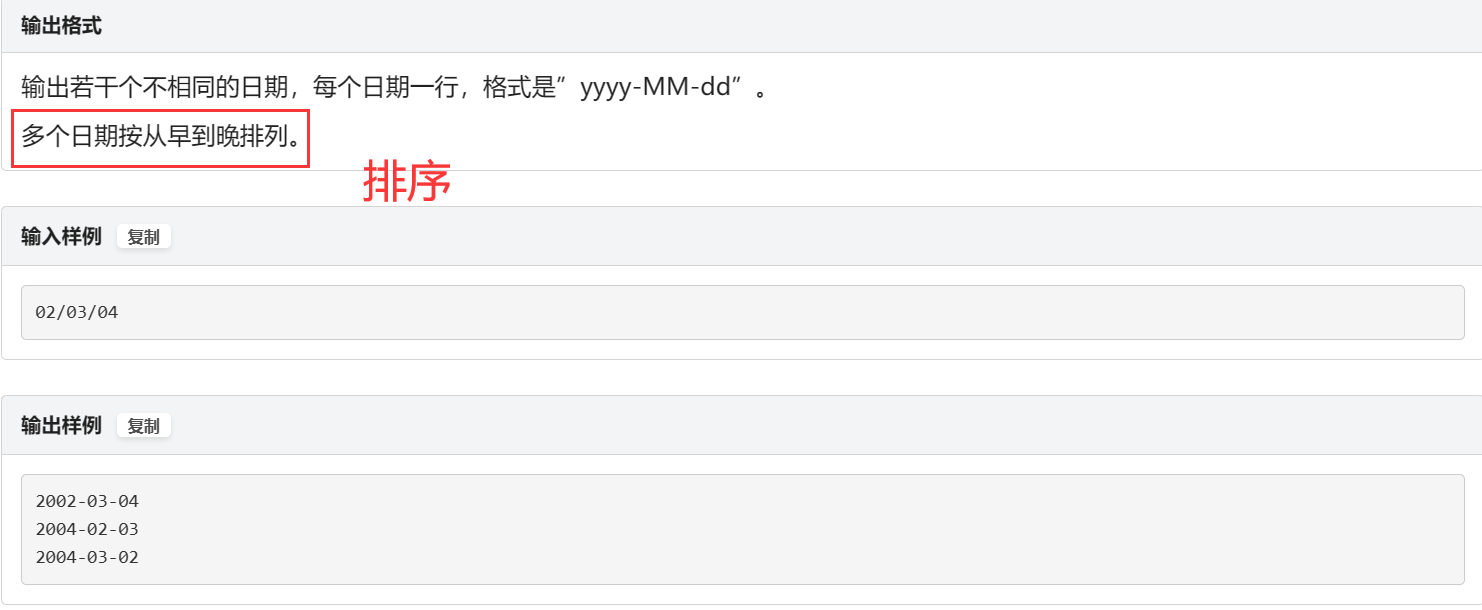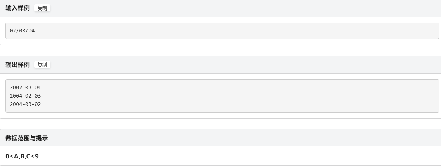 mian函数: int main() { int a, b, c; scanf("%d/%d/%d", &a, &b, &c); judge(a, b, c); //可能为年,月,日 judge(c, a, b); //可能为月,日,年 judge(c, b, a); //可能为日,月,年 qsort(data, k, sizeof(data[0]), cmp); for (int i = 0; i < k; i++) printf("%d-%02d-%02d\n", data[i].year, data[i].month, data[i].day); return 0; }