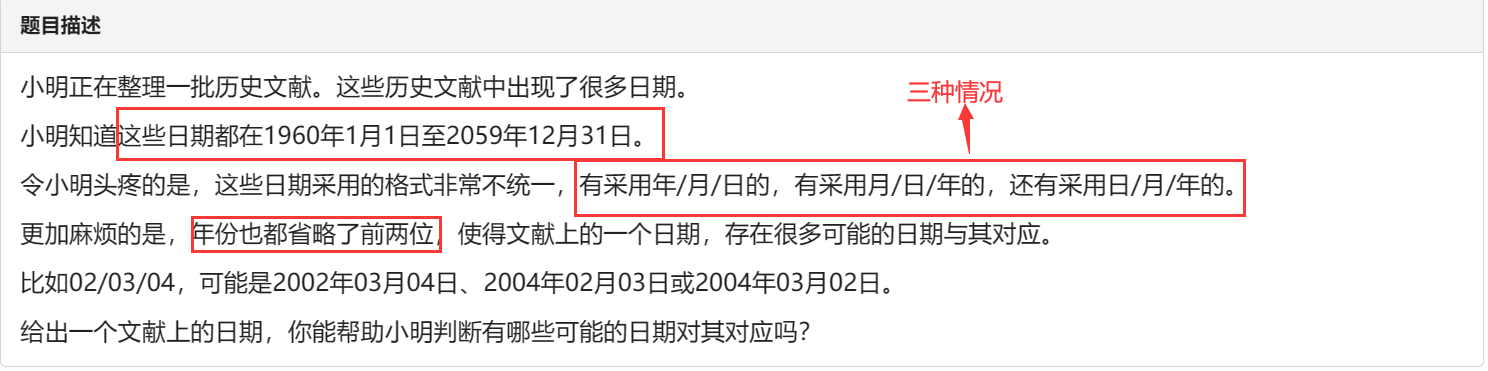 小明正在整理一批历史文献。这些历史文献中出现了很多日期。 小明知道这些日期都在1960年1月1日至2059年12月31日。 令小明头疼的是,这些日期采用的格式非常不统一,有采用年/月/日的,有采用月/日/年的,还有采用日/月/年的。 更加麻烦的是,年份也都省略了前两位,使得文献上的一个日期,存在很多可能的日期与其对应。 比如02/03/04,可能是2002年03月04日、2004年02月03日或2004年03月02日。 给出一个文献上的日期,你能帮助小明判断有哪些可能的日期对其对应吗?
