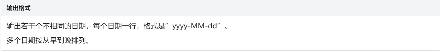 输出若干个不相同的日期,每个日期一行,格式是”yyyy-MM-dd”。 多个日期按从早到晚排列。
