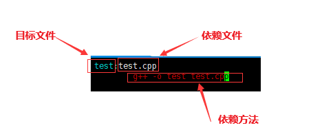 1.目标文件(target file)。 2.依赖文件(Dependent file)。 ●目标文件和依赖文件构成了依赖关系 。 ●目标文件在前,依赖文件在后,中间有: