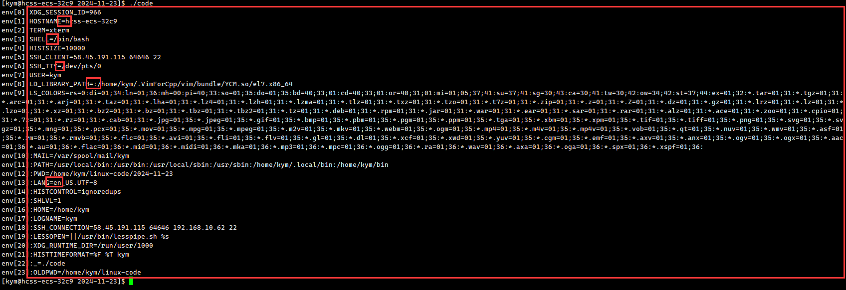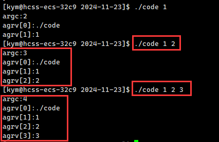 根据下面的测试结果,我们知道argv是我们在命令行输入的命令,所以argv[1]是./code ,后面的根据输入的命令而定。