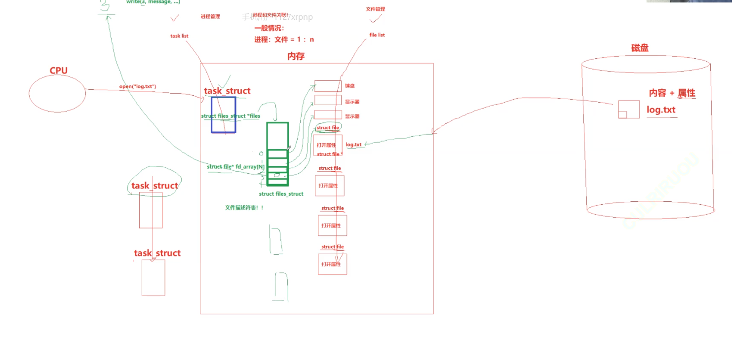 在文件中,没有被打开的文件比被打开的文件多的多。下面我们研究的被打开的文件。研究被打开的文件,是在研究文件与进程的关系,但是进程会描述文件,所以我们研究的是文件与file_struct的关系。