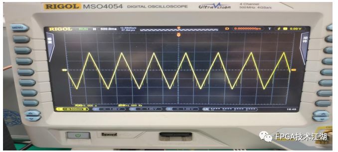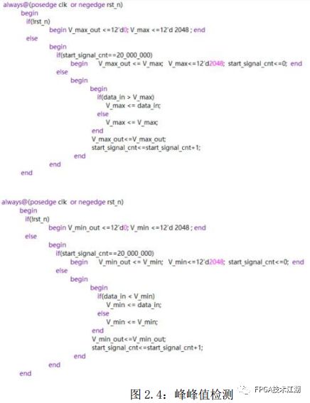 我们通过检测输入 ADC 数据的最大值和最小值,测峰峰值,每隔一段时间测一次, 输出一次。代码截图: