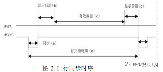 显示器的扫描方式是逐行扫描,即扫描像素点从屏幕最左上角开 始,从左向右,从上到下,每行结束时,用行同步信号进行同步;当 扫描完屏幕上所有的点,形成一帧,用场同步信号进行场同步,并使 扫描点重新回到屏幕的左上方,同时进行场消隐,开始下一帧。具体 的行同步时序与场同步时序如下图所示: