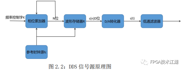 DDS 系统其主要元件有相位累加器、波形存储器、数模转换器、 低通滤波器。其中 DDS 关键部分就是相位累加器,外部时钟控制相位 累加器读取数据的地址值,通过查表,把地址直接转换成为所需信号 波形的幅度数字,再经由数模转换器把信号波形幅度的数字序列进一 步转化为模拟电压,最后传送到低通滤波器。经过滤波器处理,将数 模转换器中不理想的阶梯状波形转化为平滑的所需波形。合成信号的 正弦波、方波、三角波等波形通过特殊算法处理实现。