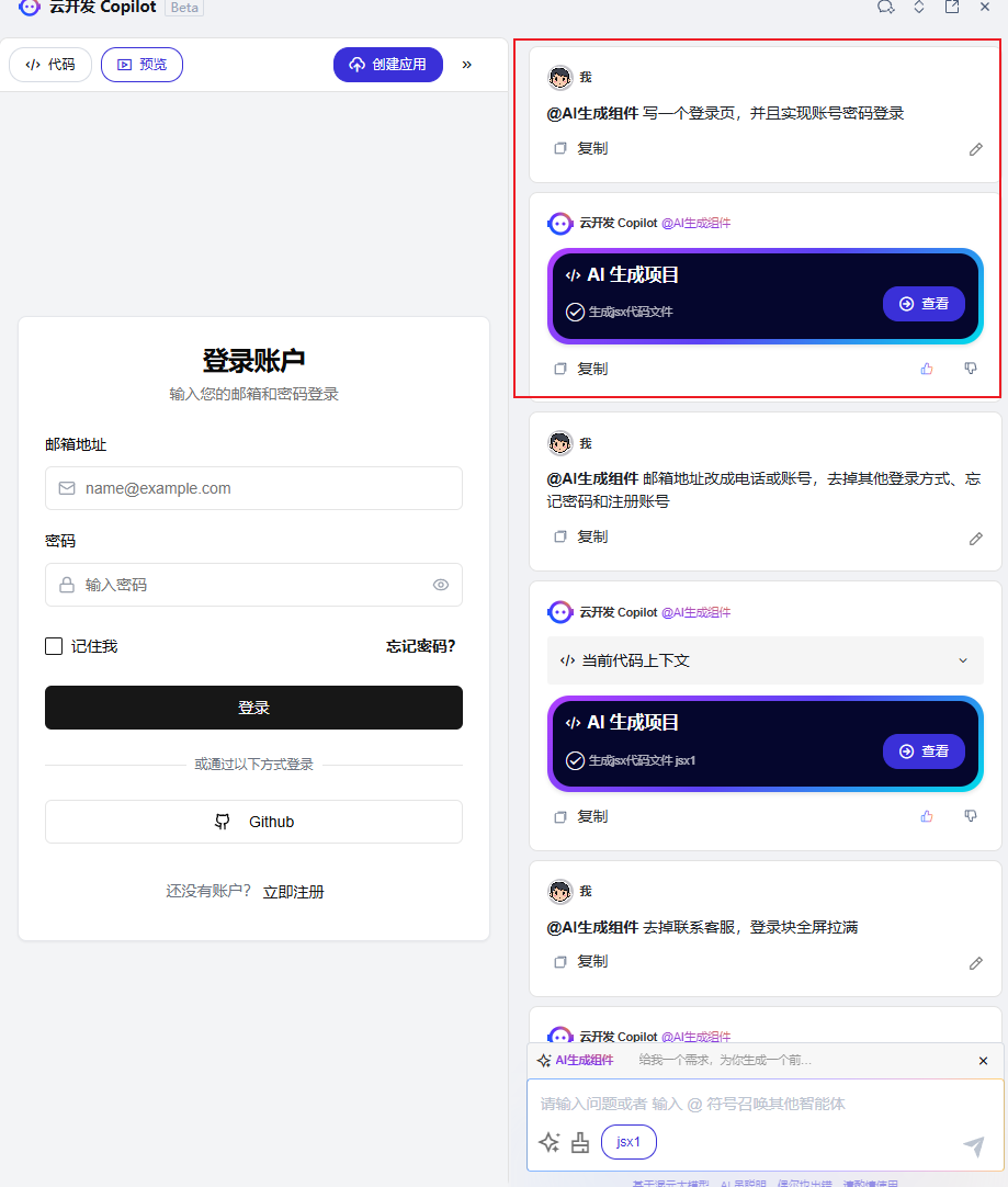 首先我告诉Copilot,帮我实现写一个登录页,并且实现账号密码登录稍等一会就会生成代码。