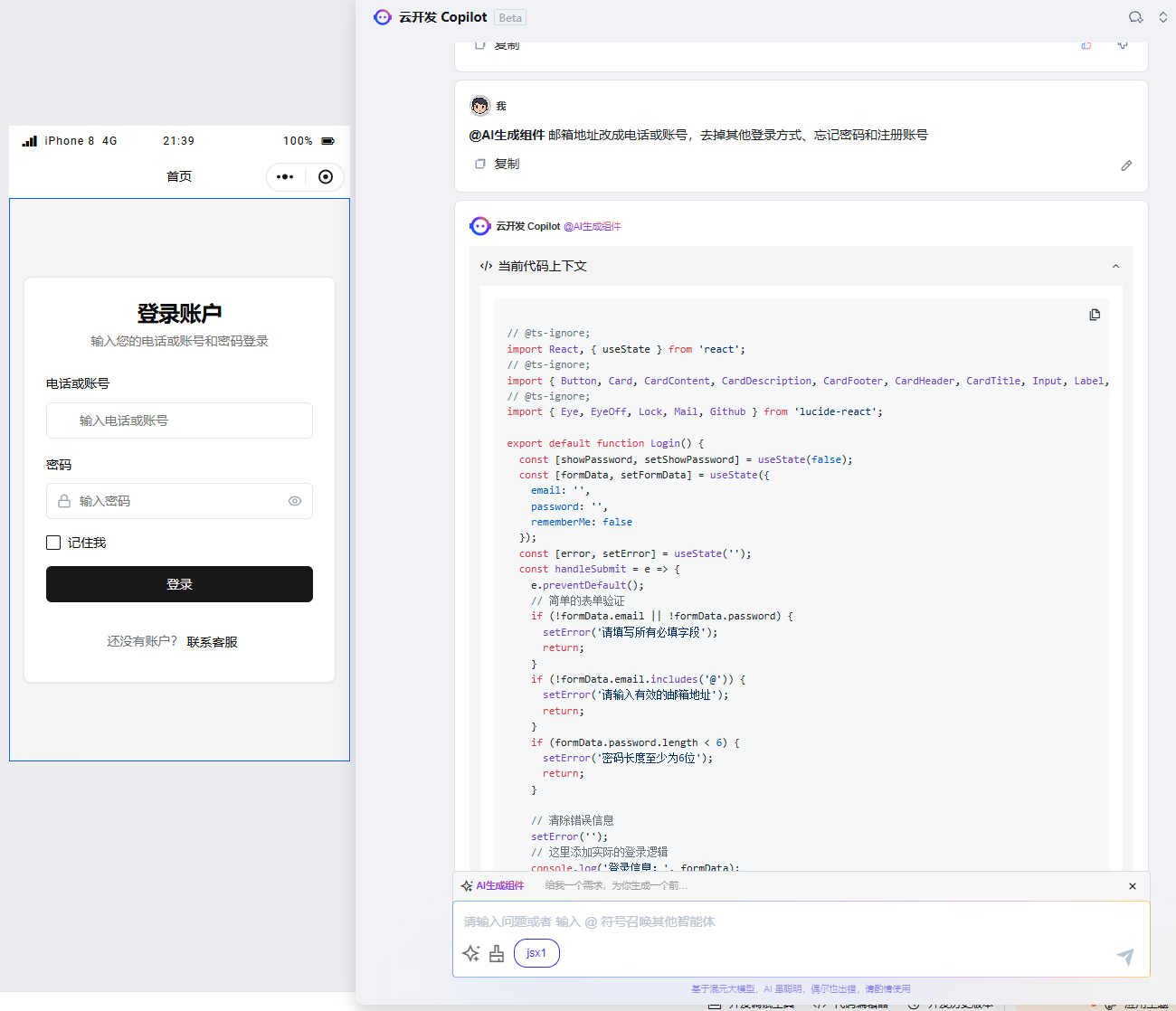 但是结合我的个人需求来说,我并不需要用邮箱登录和Github的方式,也不需要忘记密码和注册账号,,于是我向Copilot提出邮箱地址改成电话或账号,去掉其他登录方式、忘记密码和注册账号,这时候Copilot就帮我把页面更改成这样。