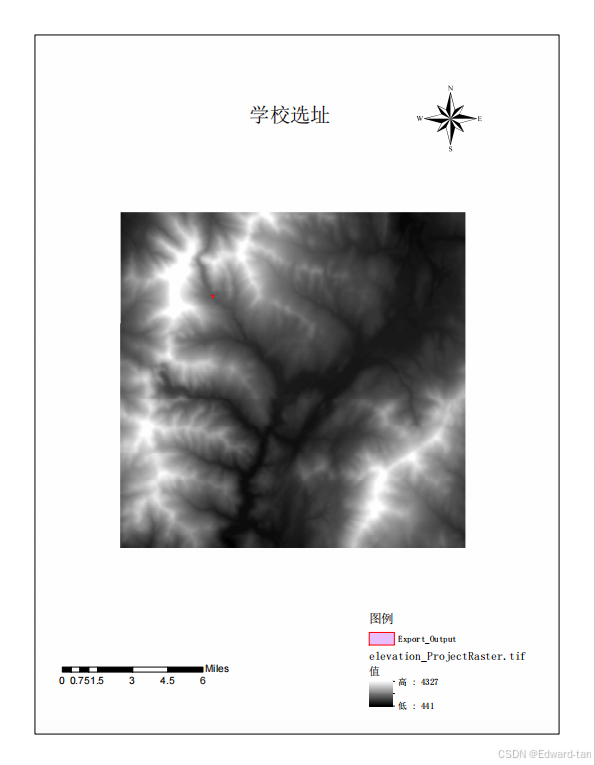 在图框中添加学校适宜性分析结果图、点击主菜单中的【插入】,添加图名、图例、比例尺、指北针、坐标格网等数绘制专题图。绘制结果如下图所示(大家也可以玩玩其他的)。