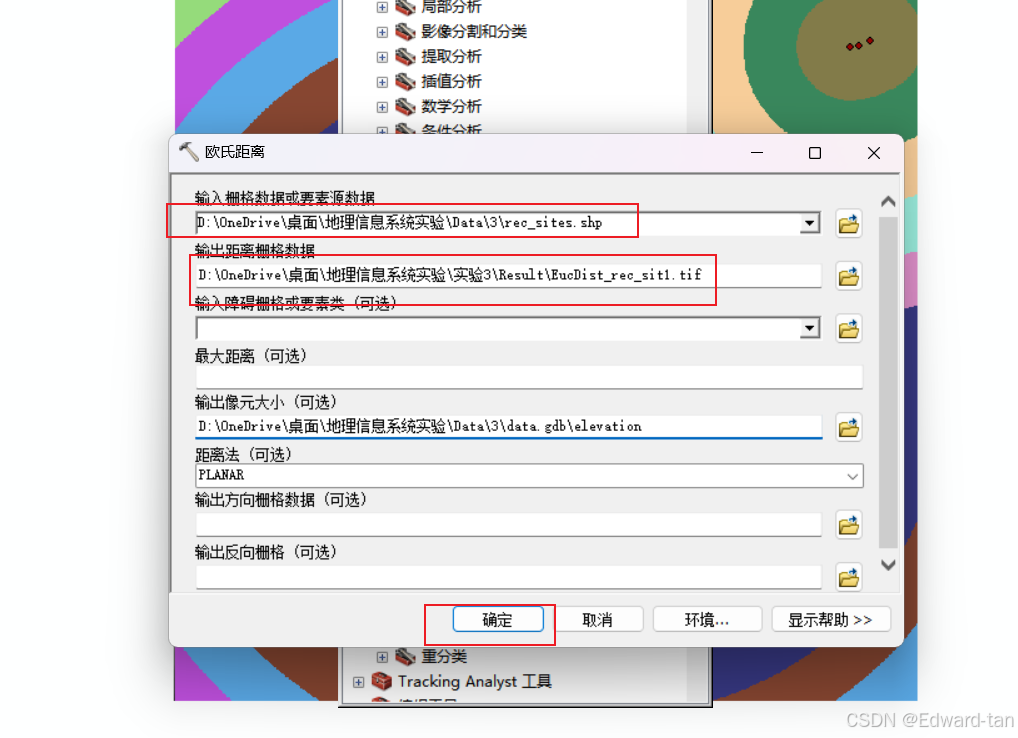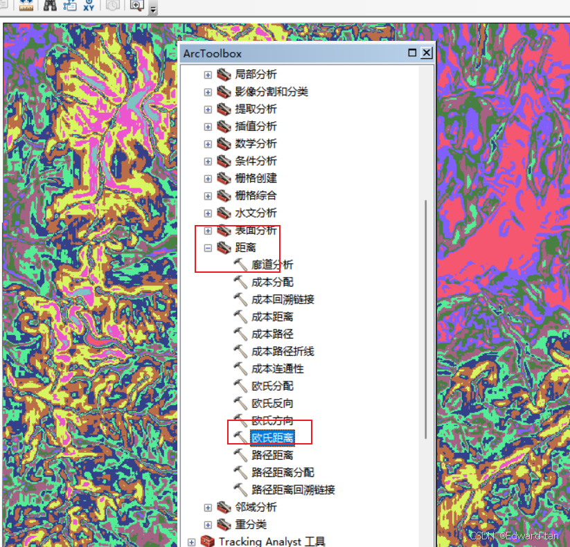 点击ArcToolbox中的【空间分析】-【距离分析】-【欧氏距离】。