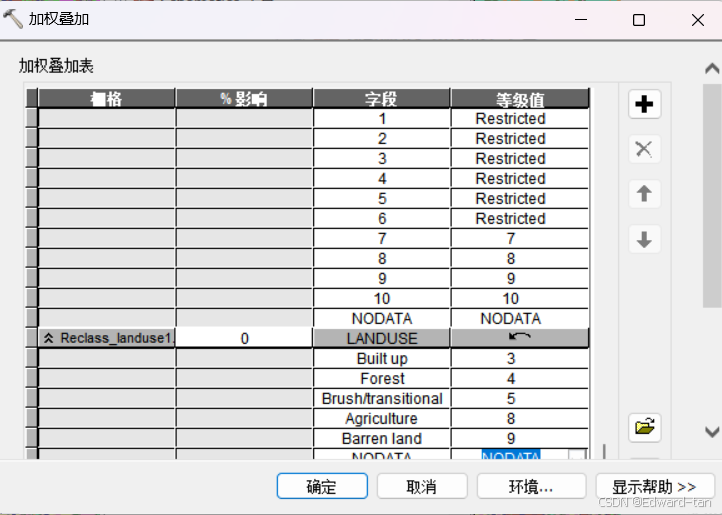 对“加权叠加表”对话框中不选择坡度大于30°的结果,即将1-6设置成Restricted。