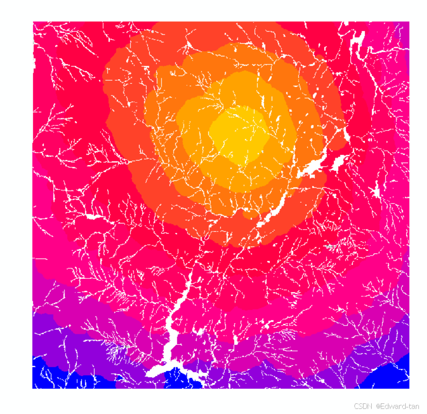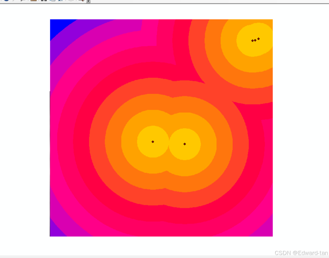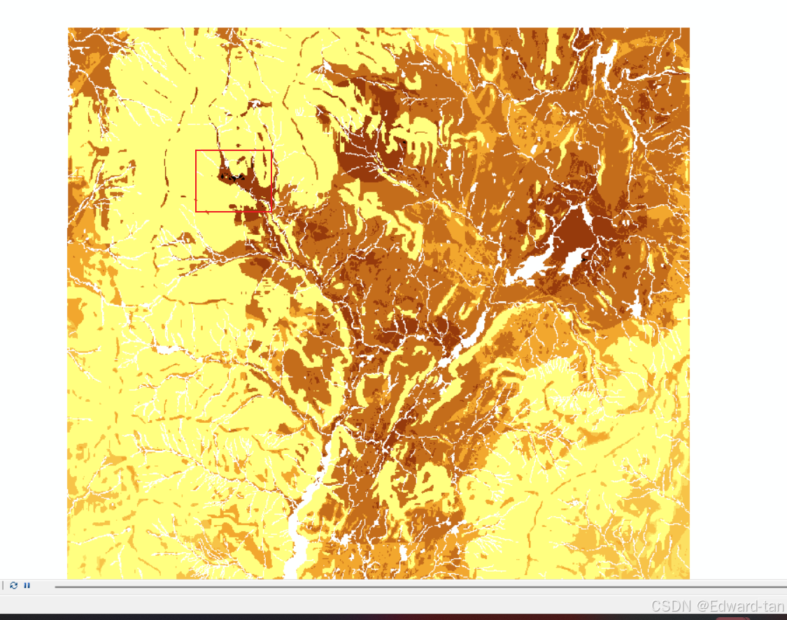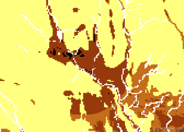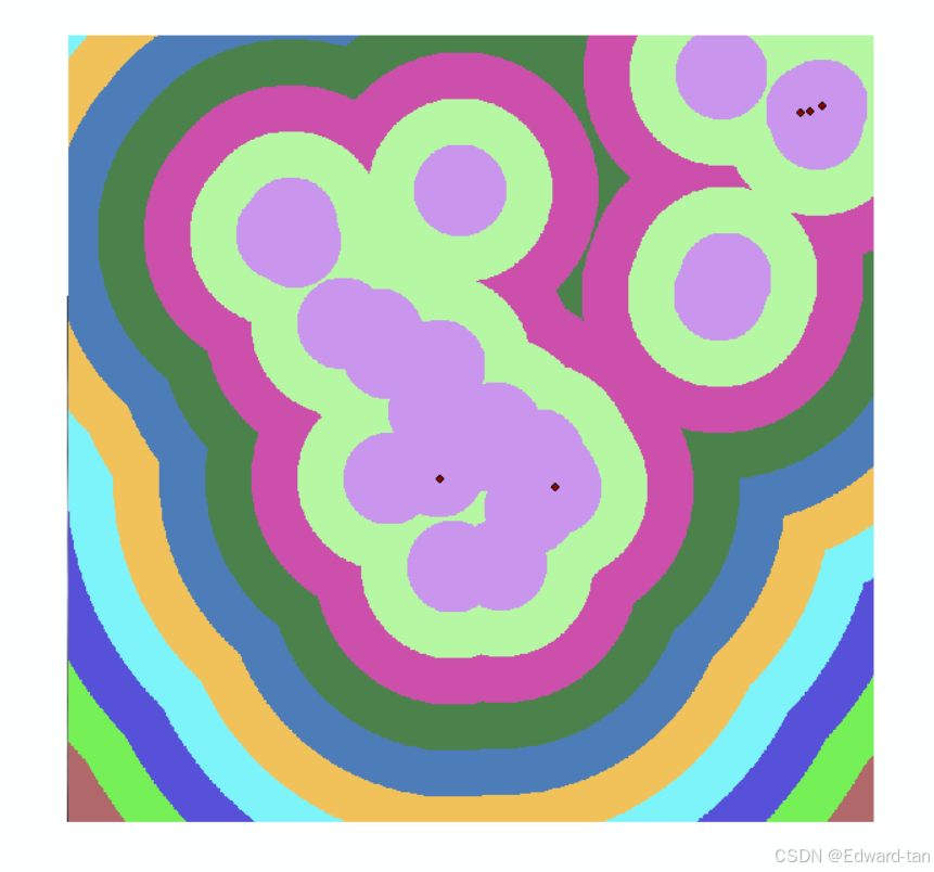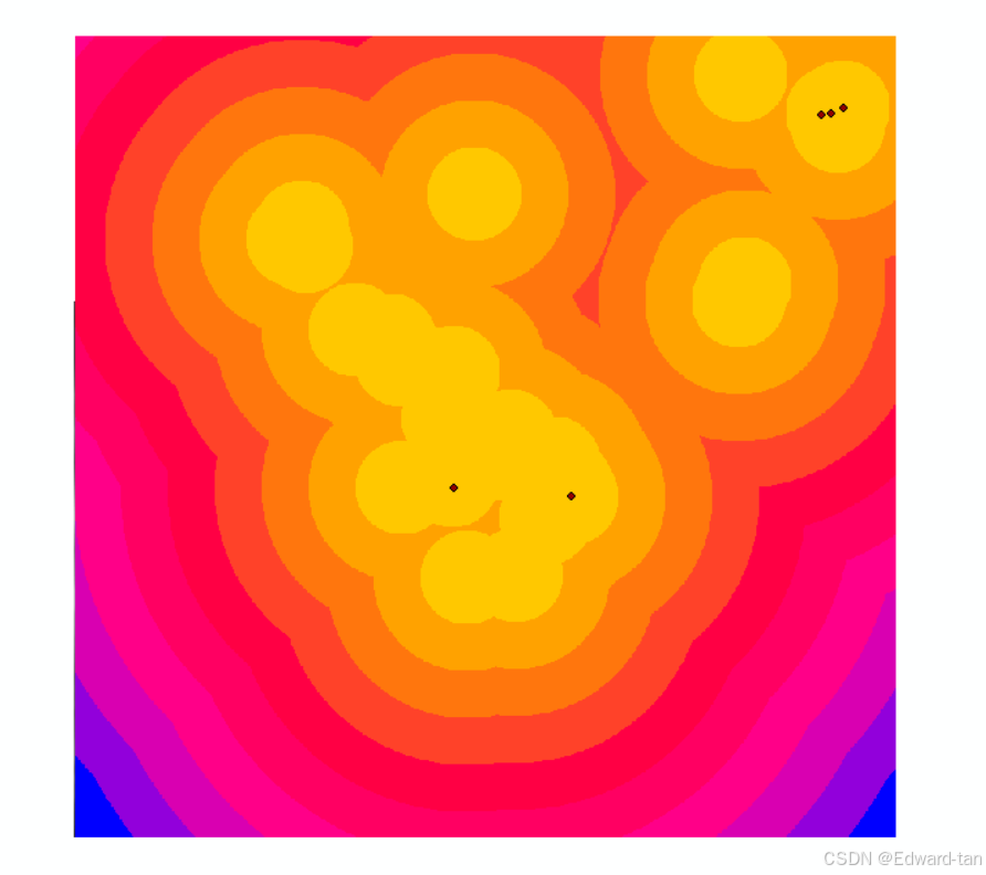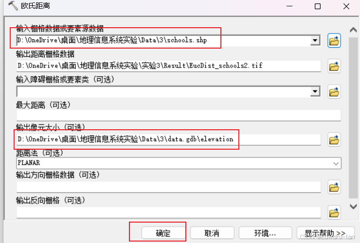 输人栅格选择学校数据,默认输出位置为Result/EucDist_schools1a.tif,设置像元大小为30,结果如下图所示。