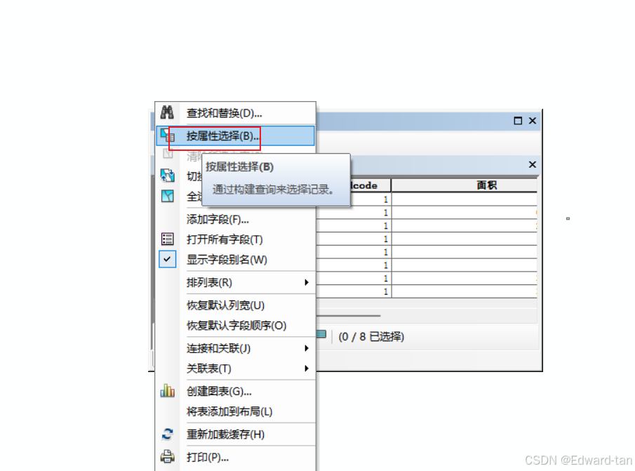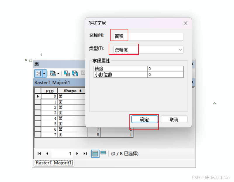 在内容列表中右键点击上一步生成的矢量数据-【打开属性表】,右键点击【表选项】--【添加字段】,将字段命名为面积,类型为双精度,点击【确定】,完成字段添加。