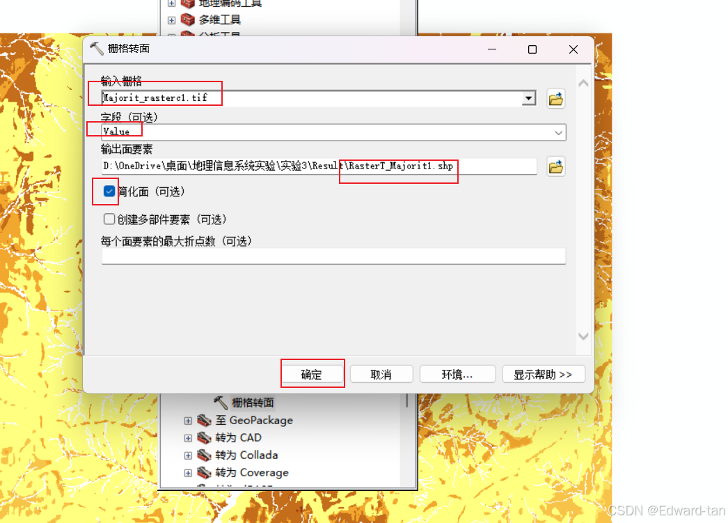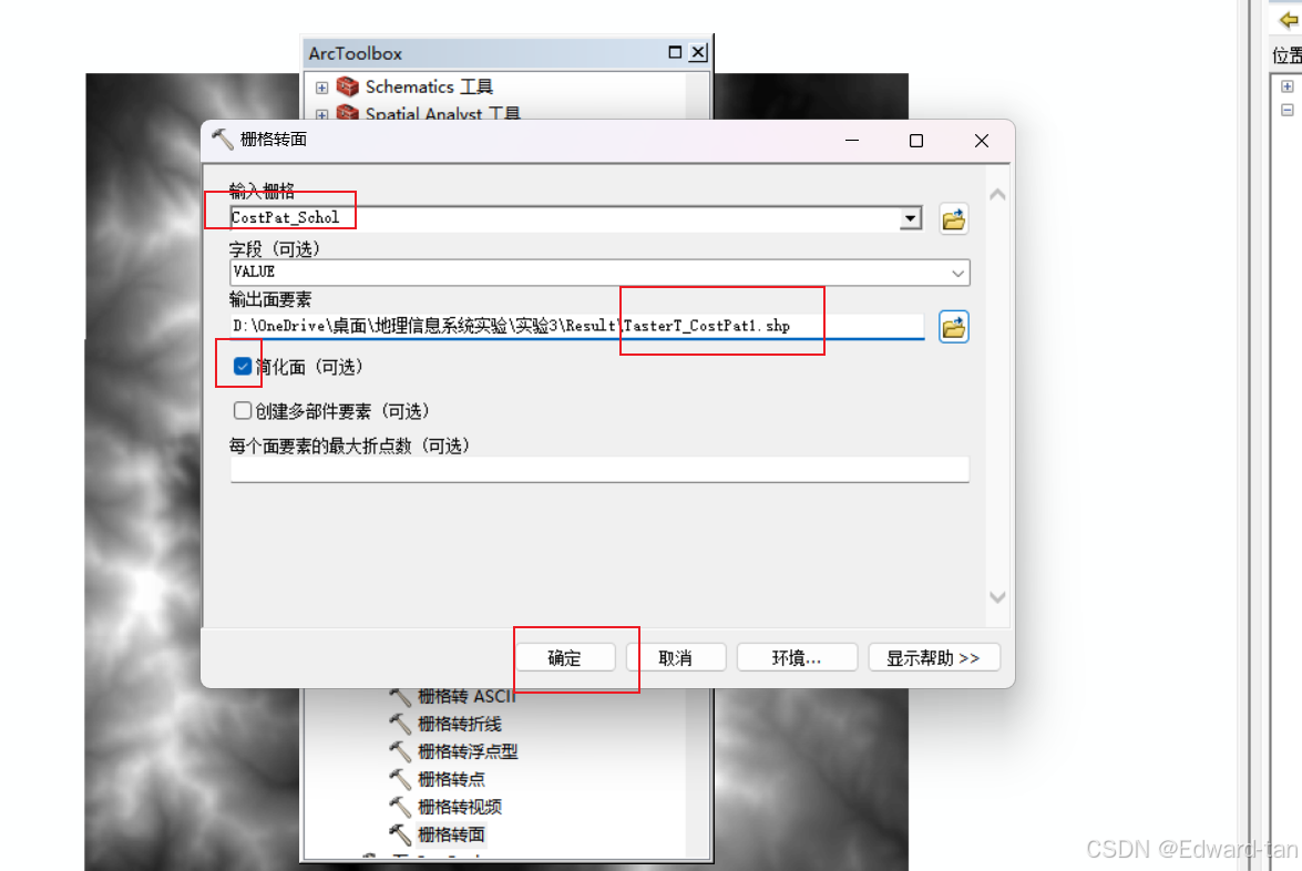 “输人栅格”选择提取的权重最大区域,选择【简化面】。