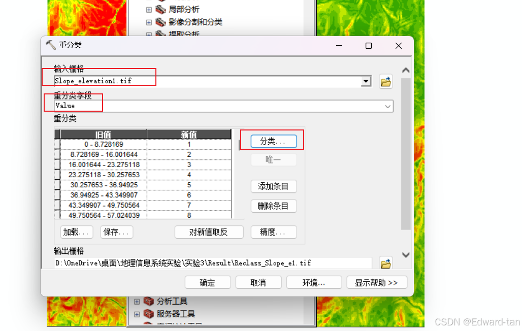 输入栅格选择坡度结果,点击“重分类”,输入栅格文件为刚提取的坡度文件Slope_elevation1.tif,设置重分类字段为value,点击对话框中的【分类】按钮。