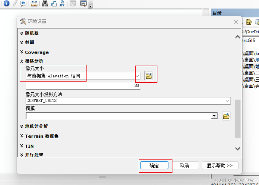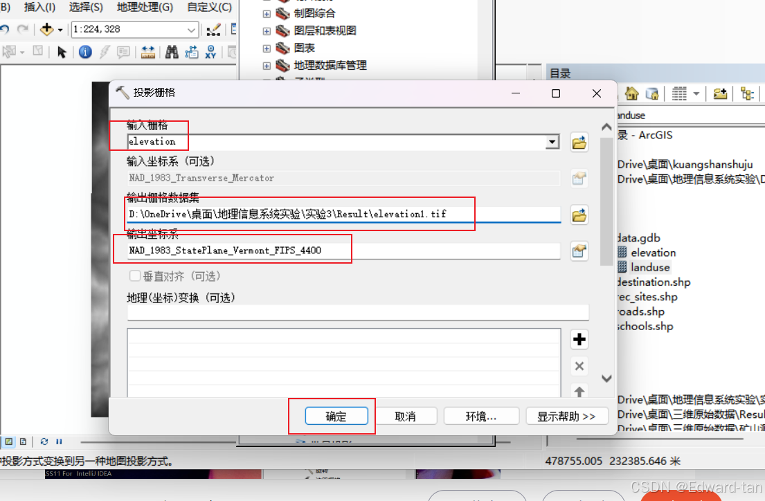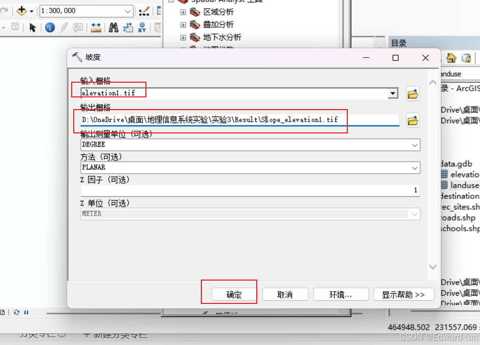 输入棚格:高程数据~eievation!”,其他设置保持默认,点击【确定】。