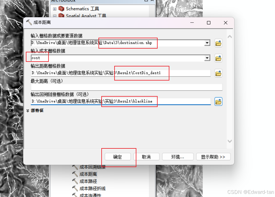 “输人栅格数据或要素源数据”选择目的地“destination”,“输入成本栅格数据”为“cost”,如下图所示.