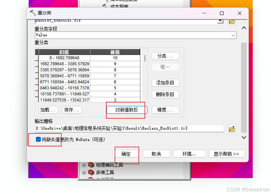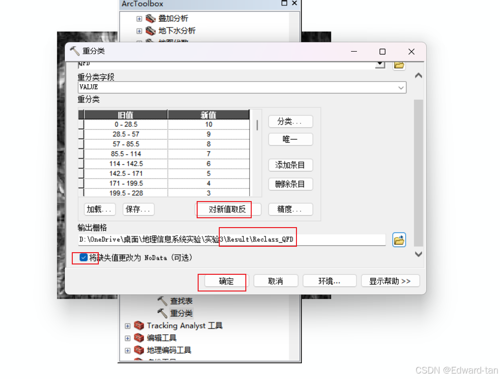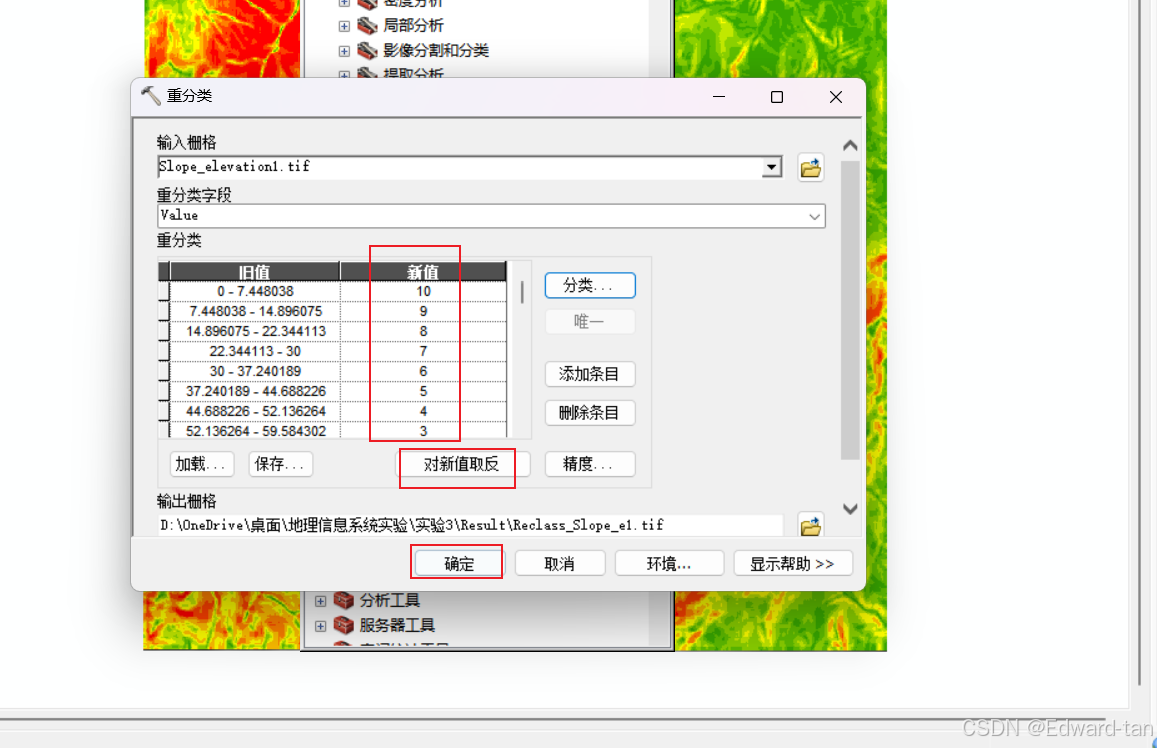 在“重分类”对话框中点击【对新值取反】,点击【确定】,设置如下图所示。