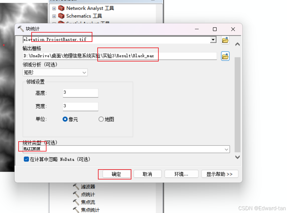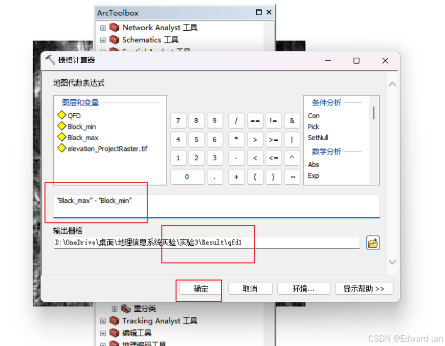 输入地图代数表达式,即用统计类型为最大值块统计结果减去统计类型为最小值块统计结果,设置如下图所示,点击【确定】。