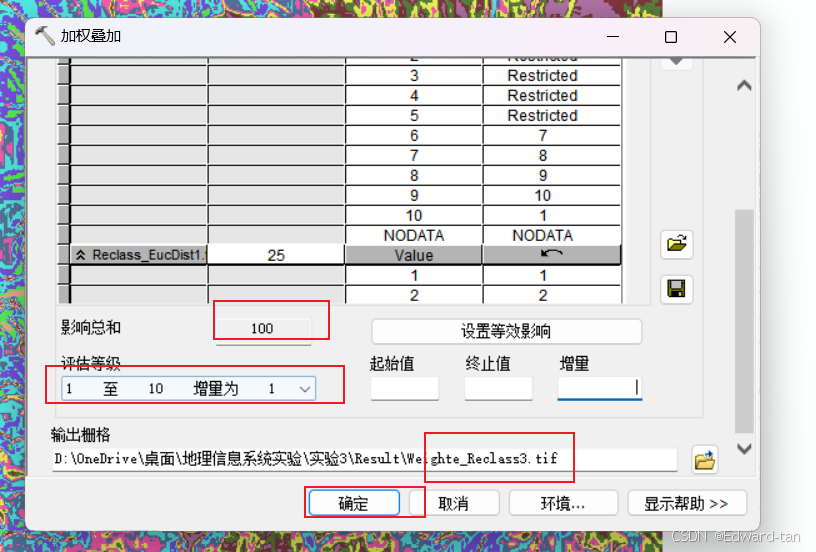 确认影响总和为100,设置评估等级为"1至10 增量为1",确定输出路径,点击确定。