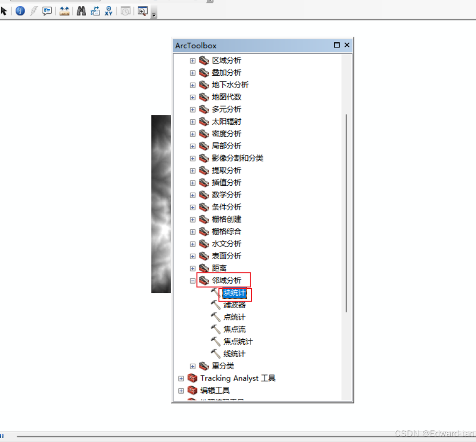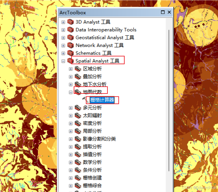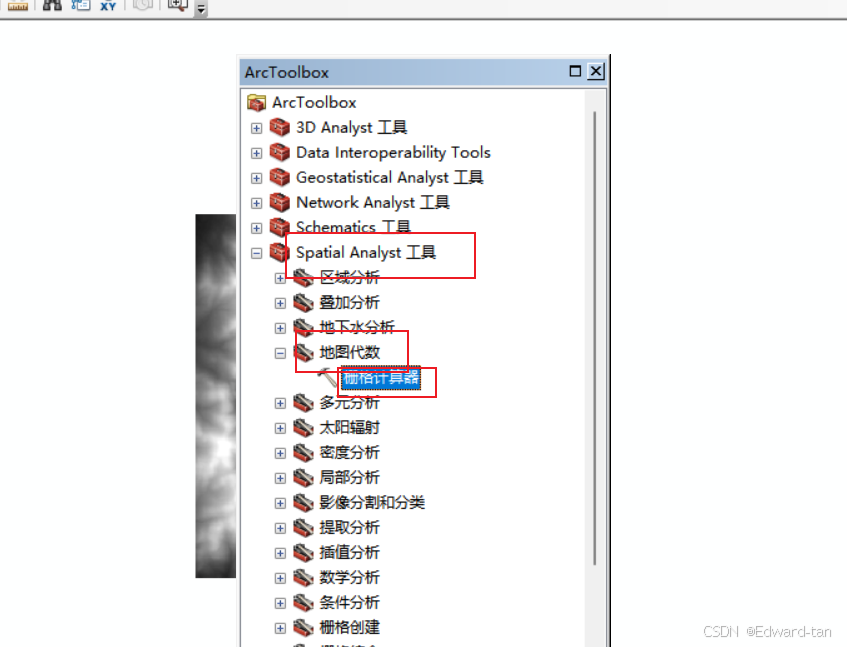 点击ArcToolbox中的【空间分析】-【地图代数】-【栅格计算器】。
