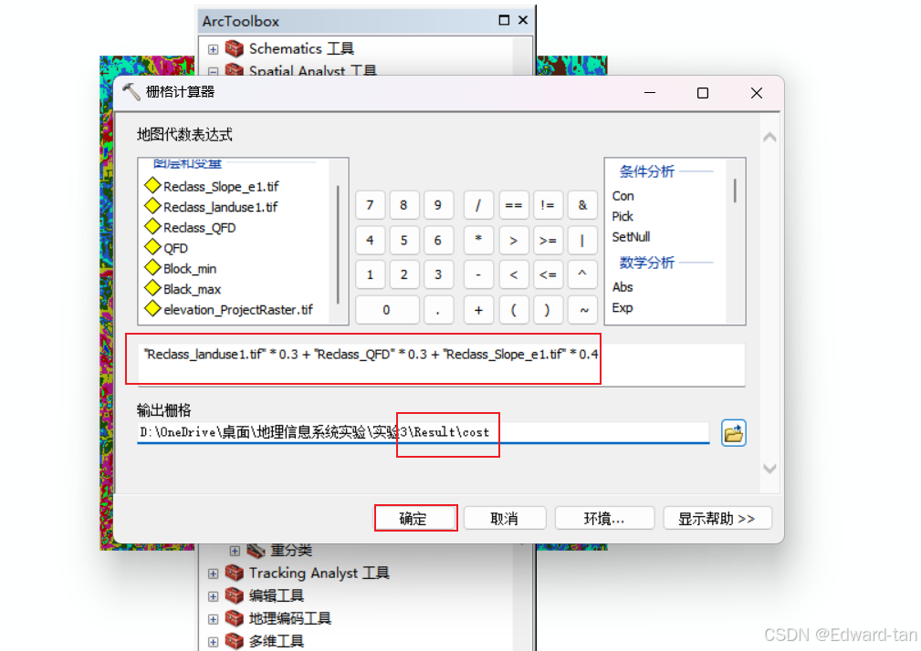 点击 ArcToolbox中的【空间分析】【地图代数】--【栅格计算器】。输人地图代数表达式:"Reclass_land"*0.3+"Reclass_QFD"*0.3+"Reclass_Slope"* 0.4。设置如下图所示。