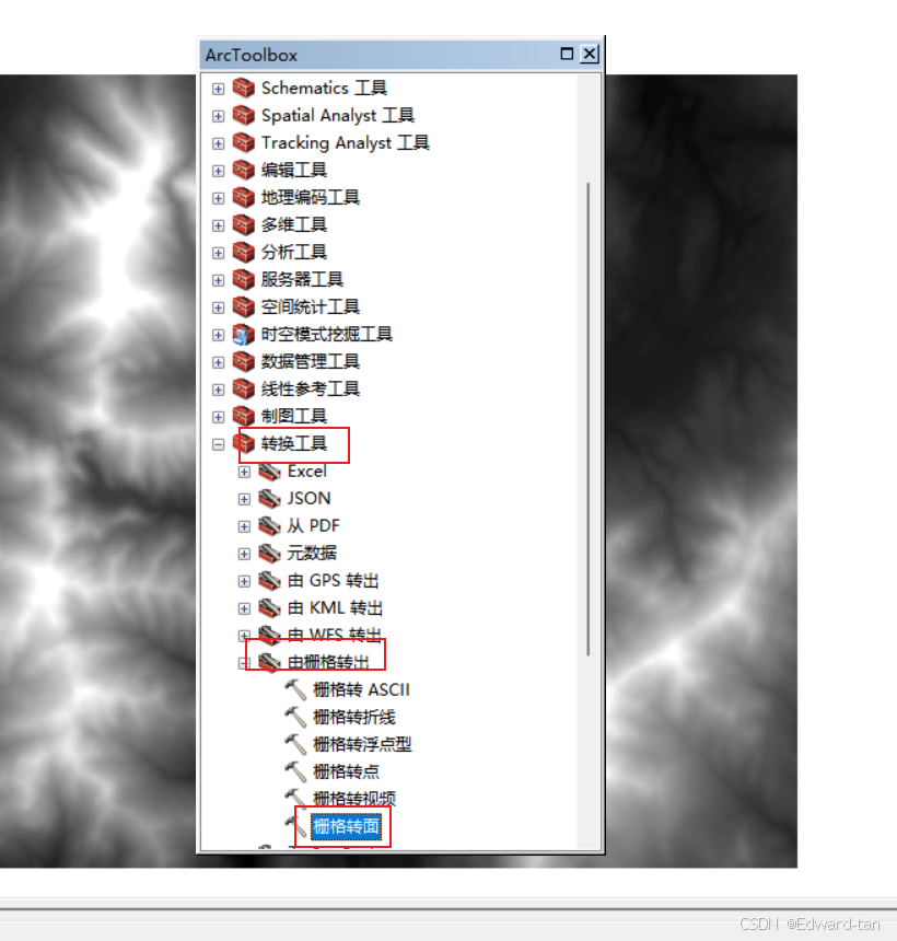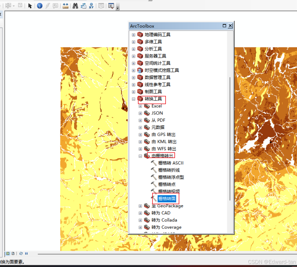将提取的权重最大区域转换成矢量,点击ArcToolbox中的【转换工具】-【由栅格转出】-【栅格转面】。