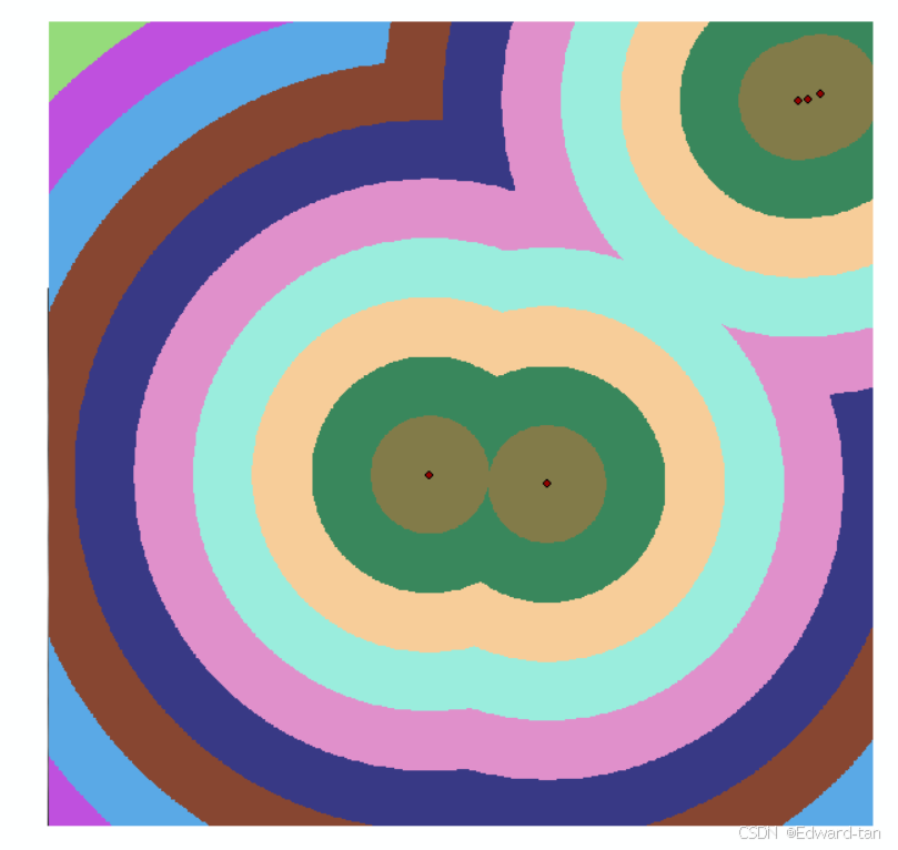 对学校数据做欧氏距离分析,提取每个栅格与最近源之间的欧氏距离,并进行重分类,提取合适的区域。