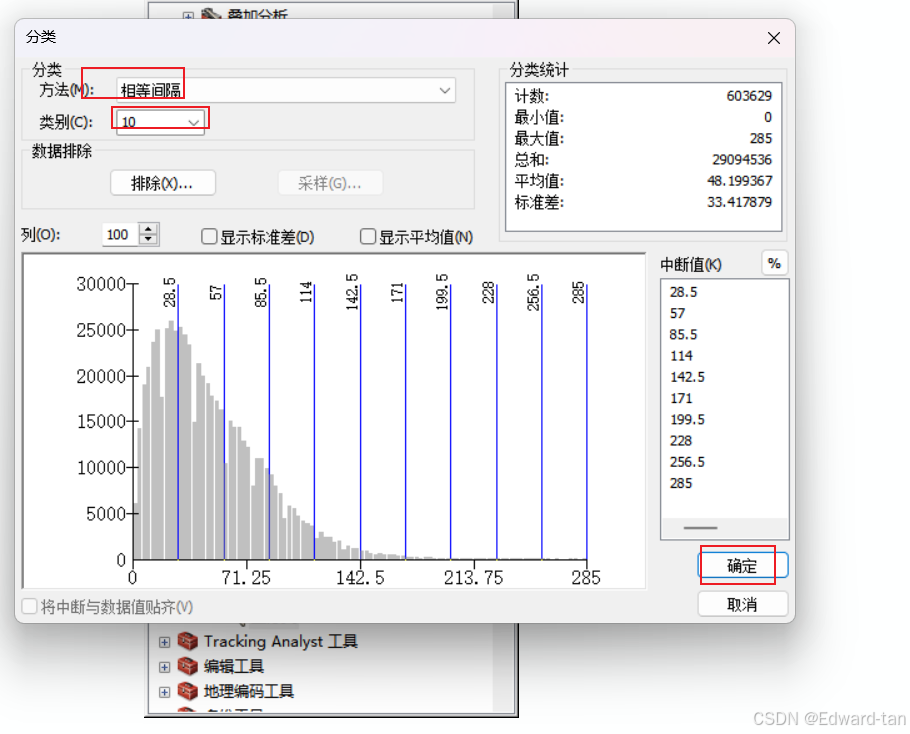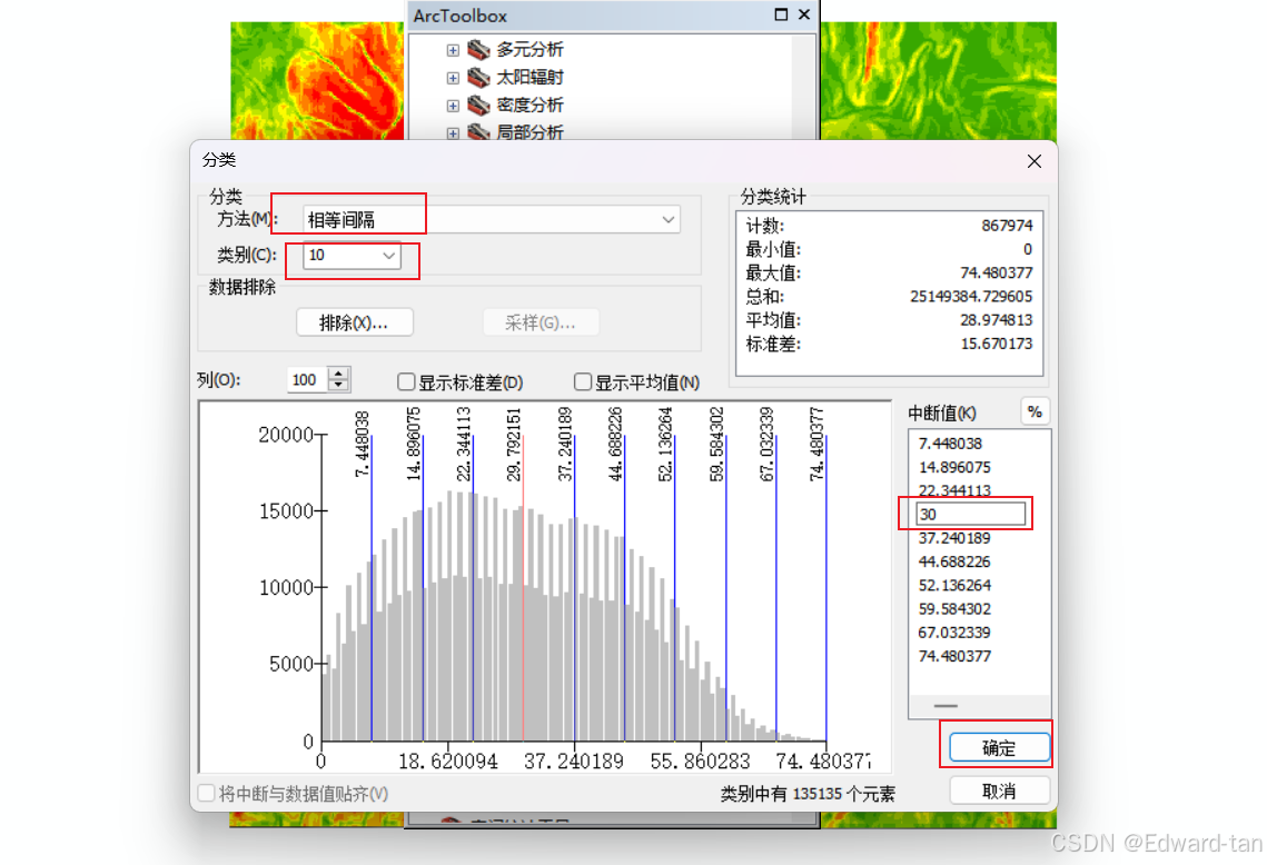弹出“分类”对话框。在“分类”对话框中设置如下参数:分类“类别”选择“10”,“方法”选择“相等间隔”,根据实验要求坡度超过30°以上的就取不考虑,在重分类时将中断值29.694746设为30,点击【确定】,设置如下图所示。