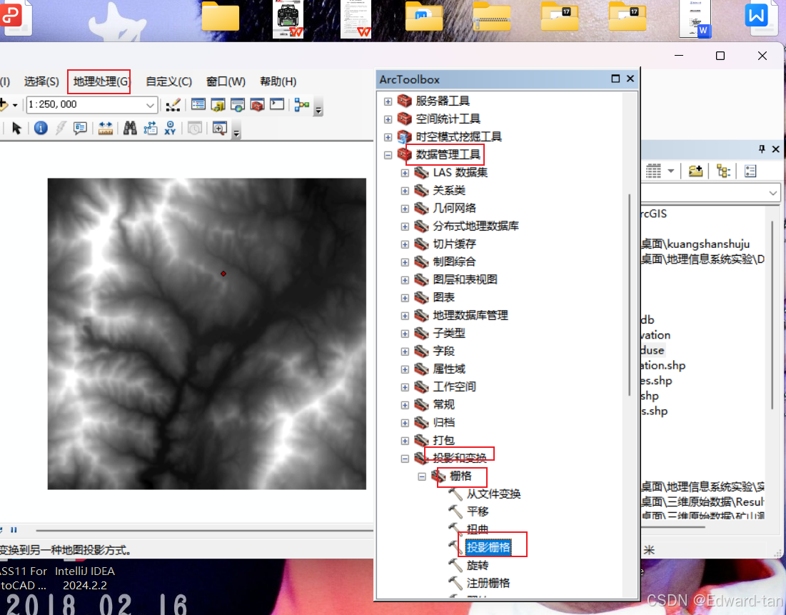 依次点击【地理处理】--【ArcToolbox工具】--【数据管理工具】--【投影和变换】--【栅格】--【投影栅格】。
