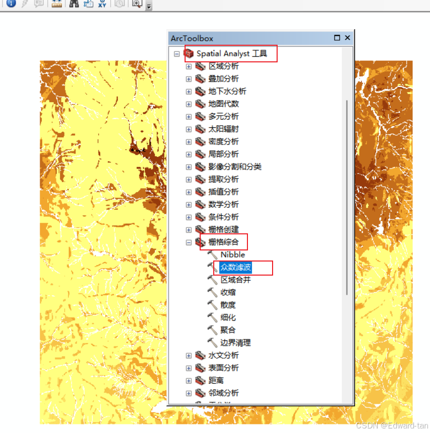 利用众数滤波工具对得到的适宜区进行处理,处理掉细碎的像元,点AreToolbox 中的【空间分析】--【栅格综合】-【众数滤波】,如下图所示。